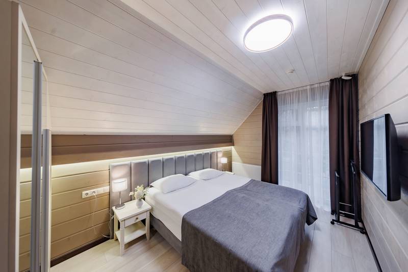 Гостям дается на выбор несколько вариантов размещения. Номера в отеле - стандартный вариант проживания, удобный и максимально доступный по цене. Коттеджи подойдут для отдыха большой компанией или семьей. Этот вариант подойдет ценителям приватности и комфорта. У жителей домиков есть возможность пользовать зоной для барбекю, собственной кухней и парковкой. Также гости могут размещаться в зоне глемпинга, что ценится любителями уединения, медитации, близости к природе.